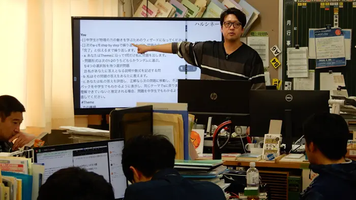 文科省の「生成AIパイロット校」に指定された飯山満中学校で16日、教員研修が行われた。教師らは実際にCHATGPT3.5を使ってその特性を学びながら、活用へのイメージを膨らませた。テスト問題についても活用してみる価値は十分にある、と教員は語った。